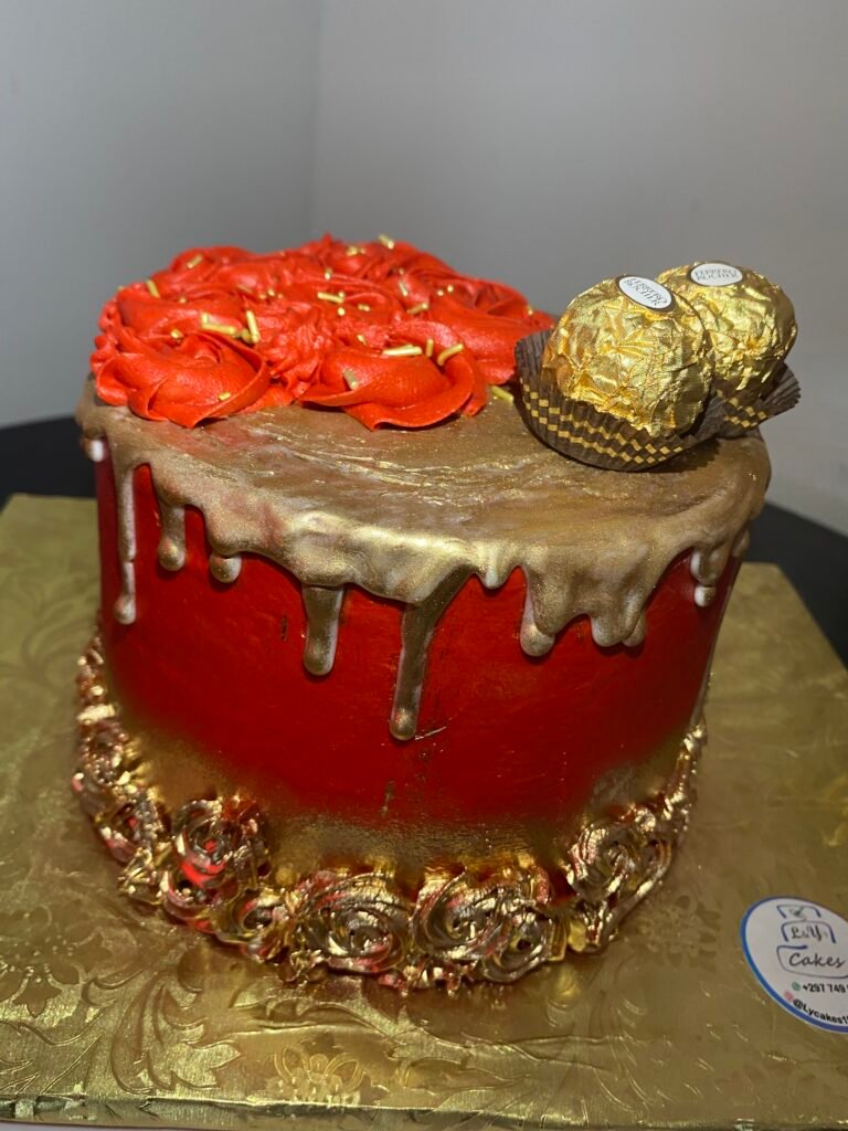 This is an elegant cake, covered in deep red frosting, enhanced with striking gold drizzle running down the sides. The top is crowned with red rosettes, creating a luxurious and festive design.