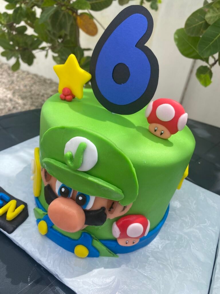 This is a single-tier children’s birthday cake with vibrant bright green frosting, inspired by the world of Super Mario Bros. A flat figure of Luigi’s face with his green cap and blue overalls adorns the front of the cake.